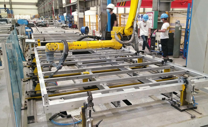 ? ? 除此之外,南南鋁通過設計通用的、可調節的車底架工裝夾具,同步電機驅動工裝夾具整體移動車底架,解決底邊框、副縱梁Y坐標變化無法焊接問題,實現大部分車型的車底架智能化、自動化、科技化的精密焊接。